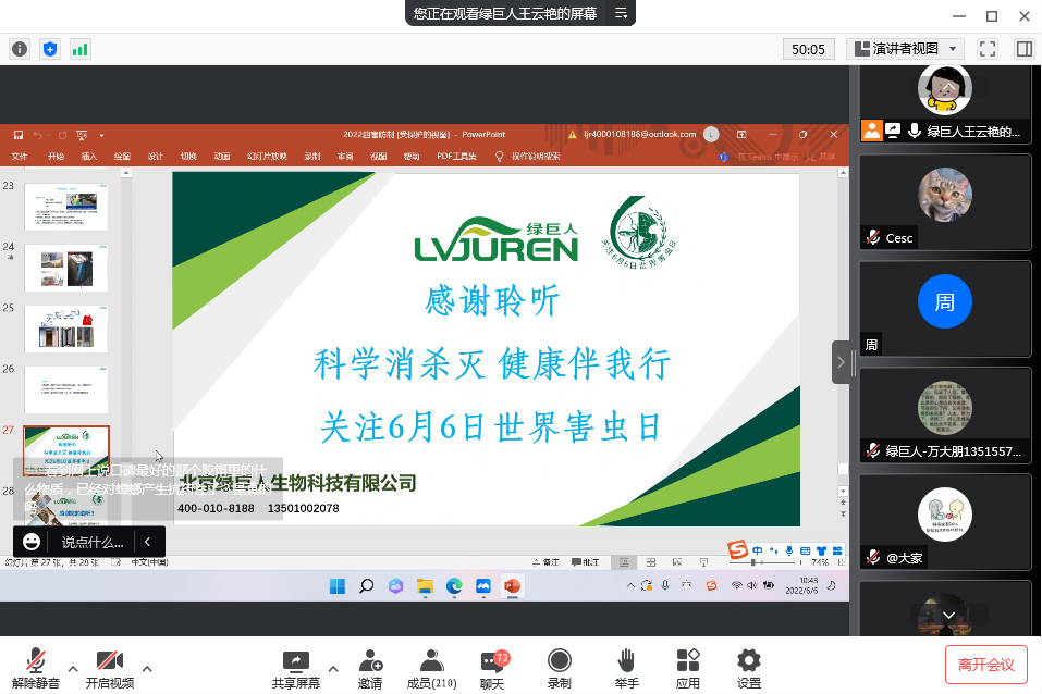 線上方面,北京綠巨人攜手北京市左家莊街道及崔各莊地區,于6月6日當天,開展 “6月6日世界害蟲日主題消殺四害講座” 線上培訓,由沈陽農業大學植物保護專業錢海濤博士主講,傳播科學防制理念,消除疾病傳播危害,提升轄區內單位、商戶及居民對有害生物防制的正確認知、藥物安全管理及應用、應急處理方法及病媒防制專業公司如何選擇等消殺知識,共計參加培訓人數達300人,轄區單位和居民熱烈響應,在“專家問答環節中”,屏幕上布滿了居民們迫切想要了解的各種消殺問題,錢博士一一解決了他們居家和辦公中苦惱的防制四害的問題。