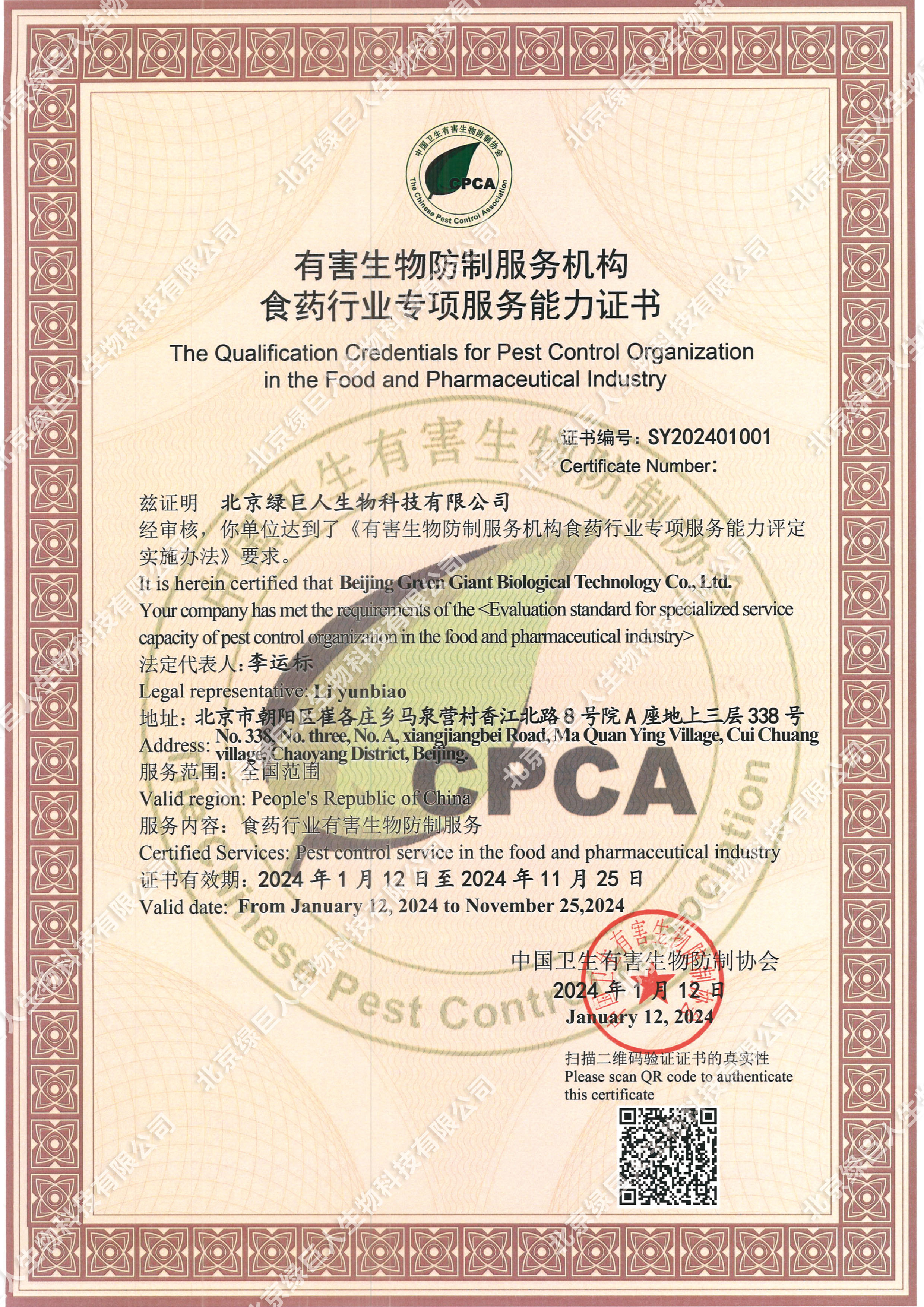 2024年1月12日,北京綠巨人生物科技有限公司獲得有害生物防制服務機構食藥行業專項服務能力證書。“北京綠巨人”憑借13年食藥行業萬余家大、中、小企業服務案例,以及專業的服務經驗和過硬得技術水平,通過了中國衛生有害生物防制協會評審專家組一致肯定。